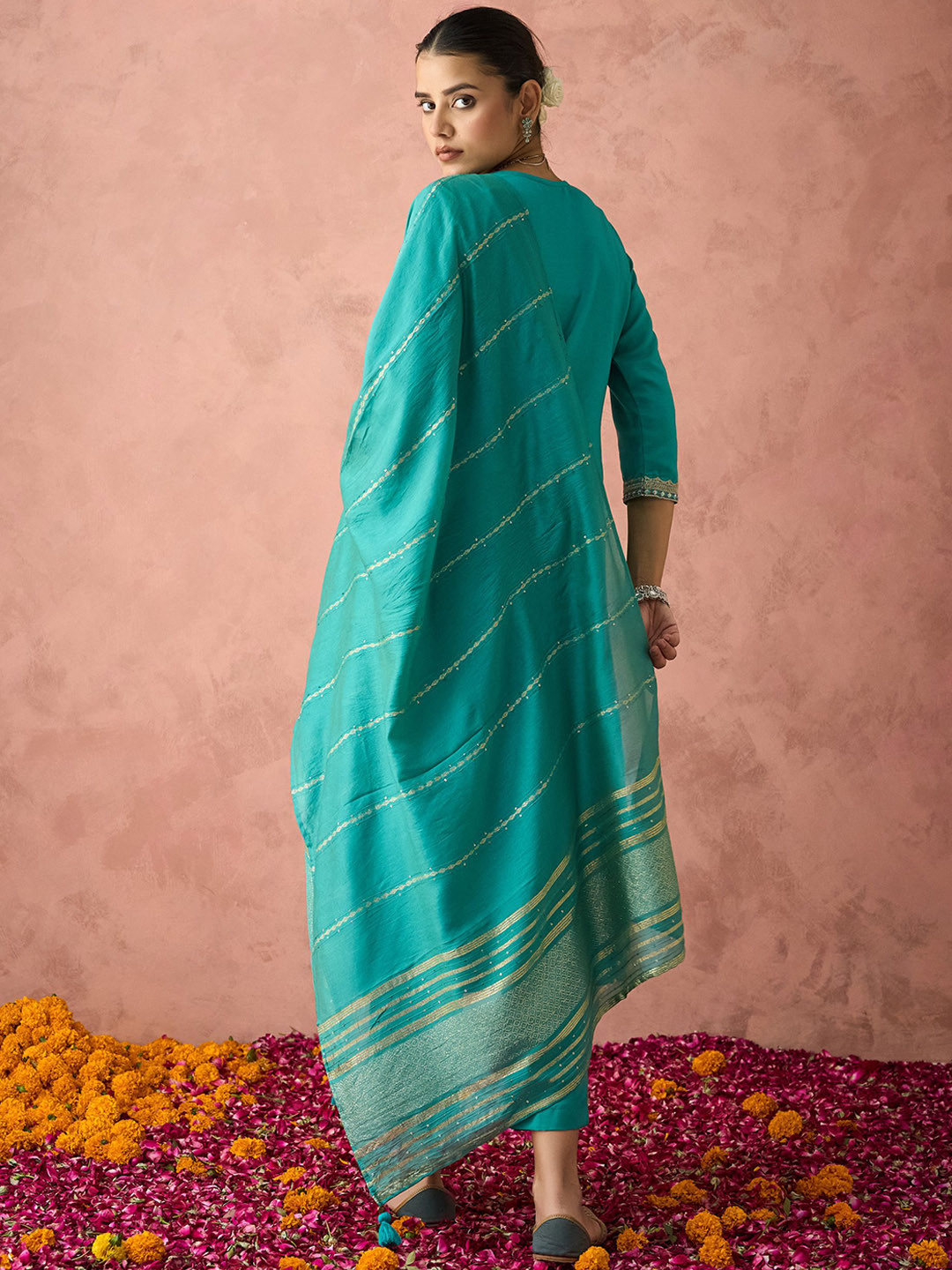 Turquoise blue & gold-toned embroidered Kurta with Trousers & dupatta