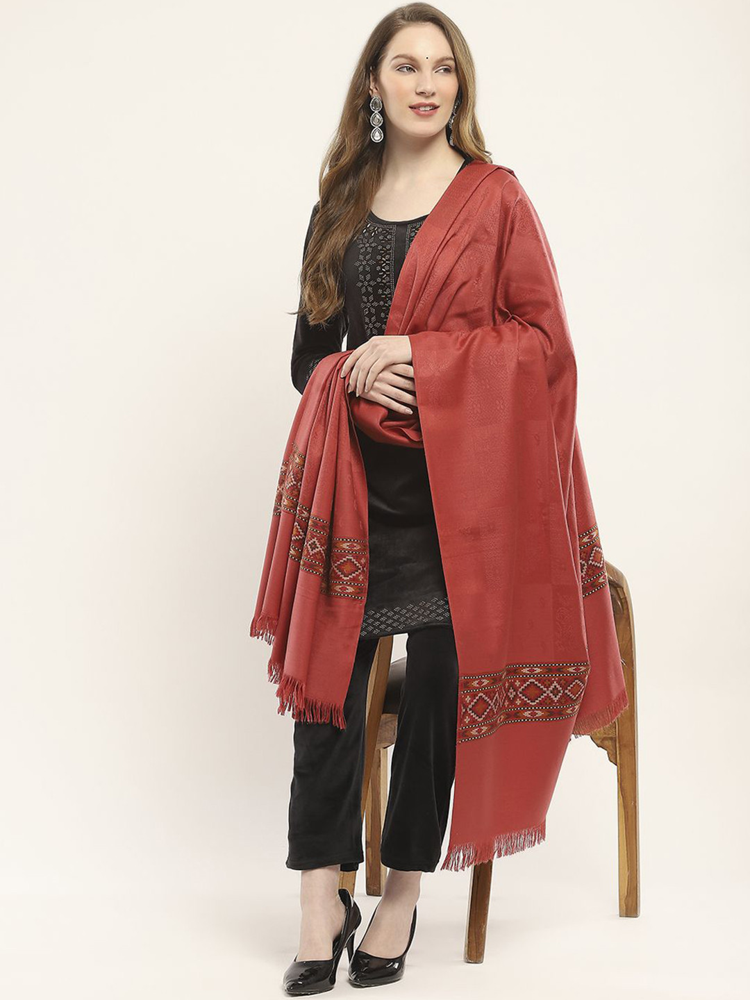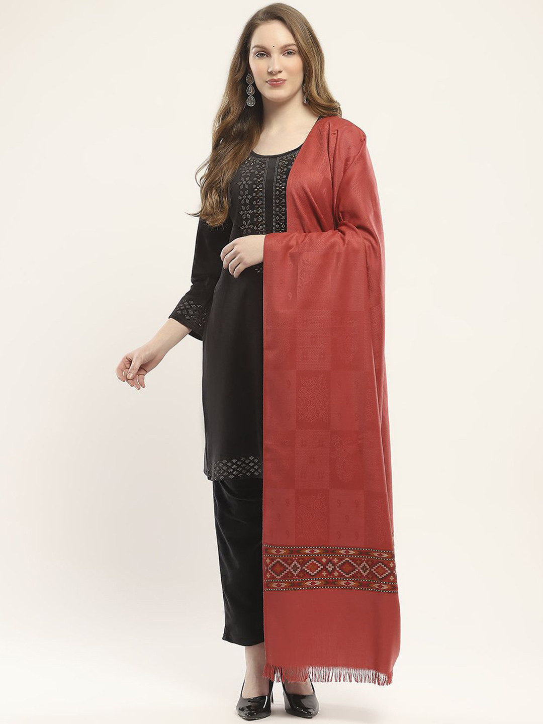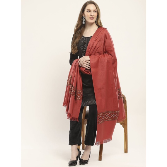 Red, grey & green self design acrylic shawl, has fringed border