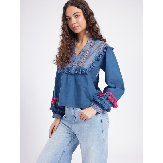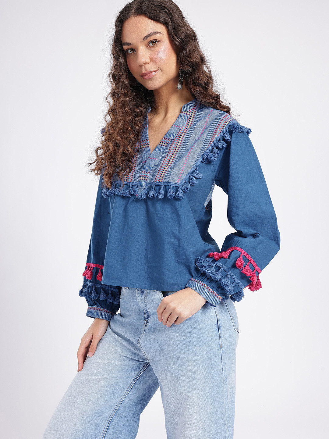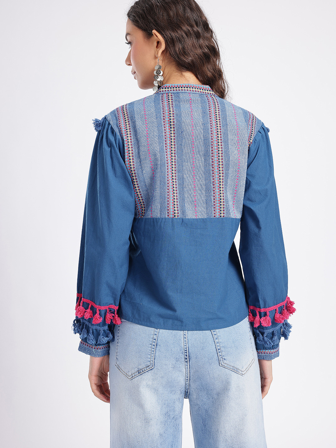 This top is a perfect blend of classic and casual style. The structured mandarin collar gives it a polished feel, which is beautifully contrasted by the relaxed fit and eye-catching tassel accents. The all-over striped pattern adds a subtle visual interest, making it easy to pair with your favorite jeans or shorts. Color: Blue & pink. Neckline: V-neck. Sleeve Styling: Long cuffed.