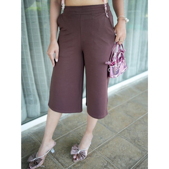 Coffee brown high-rise solid capris, waistband with slip-on closure, 2 pocket