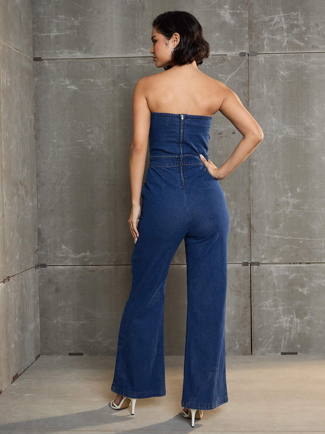 Navy blue solid basic jumpsuit ,has a off-shoulder, sleeveless, 2 pockets