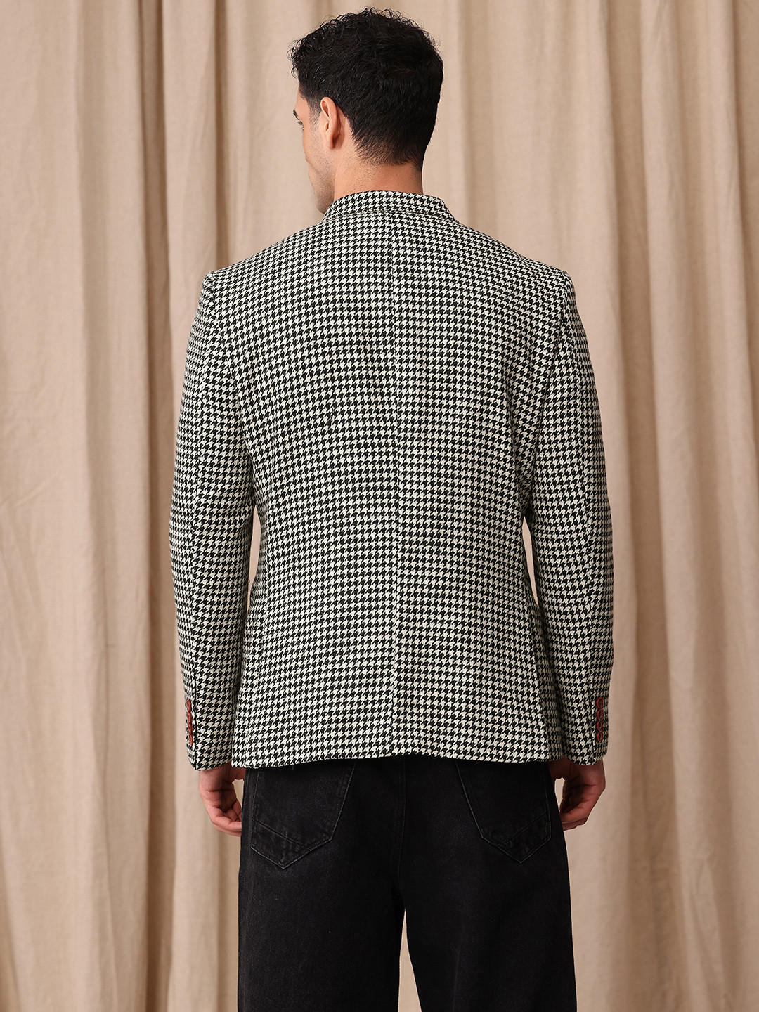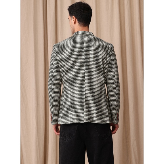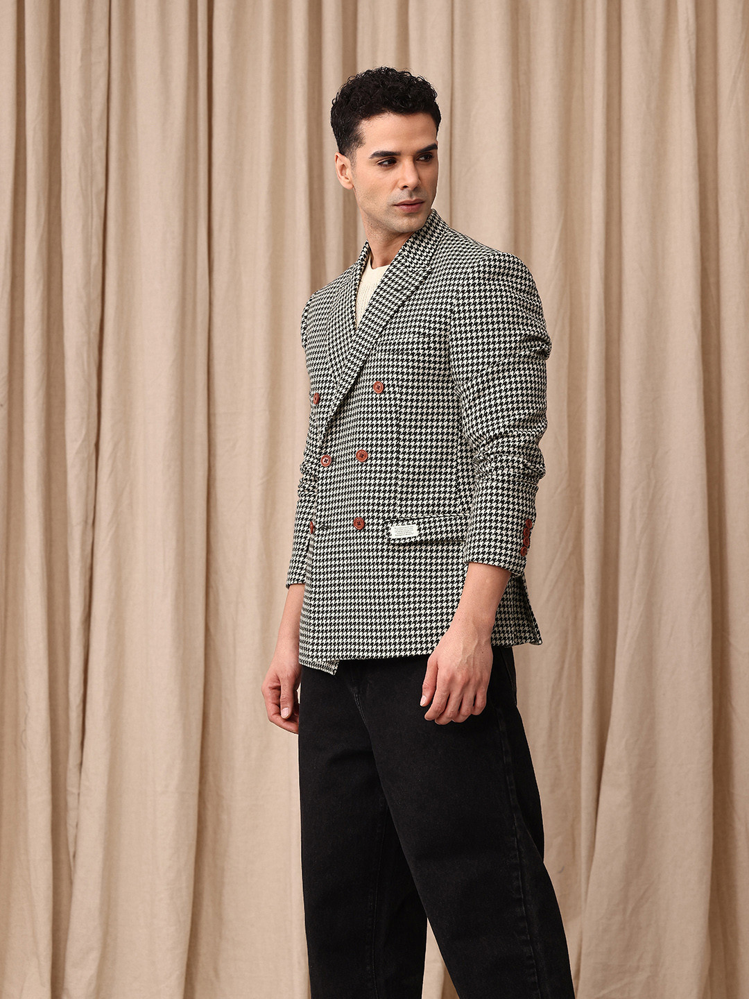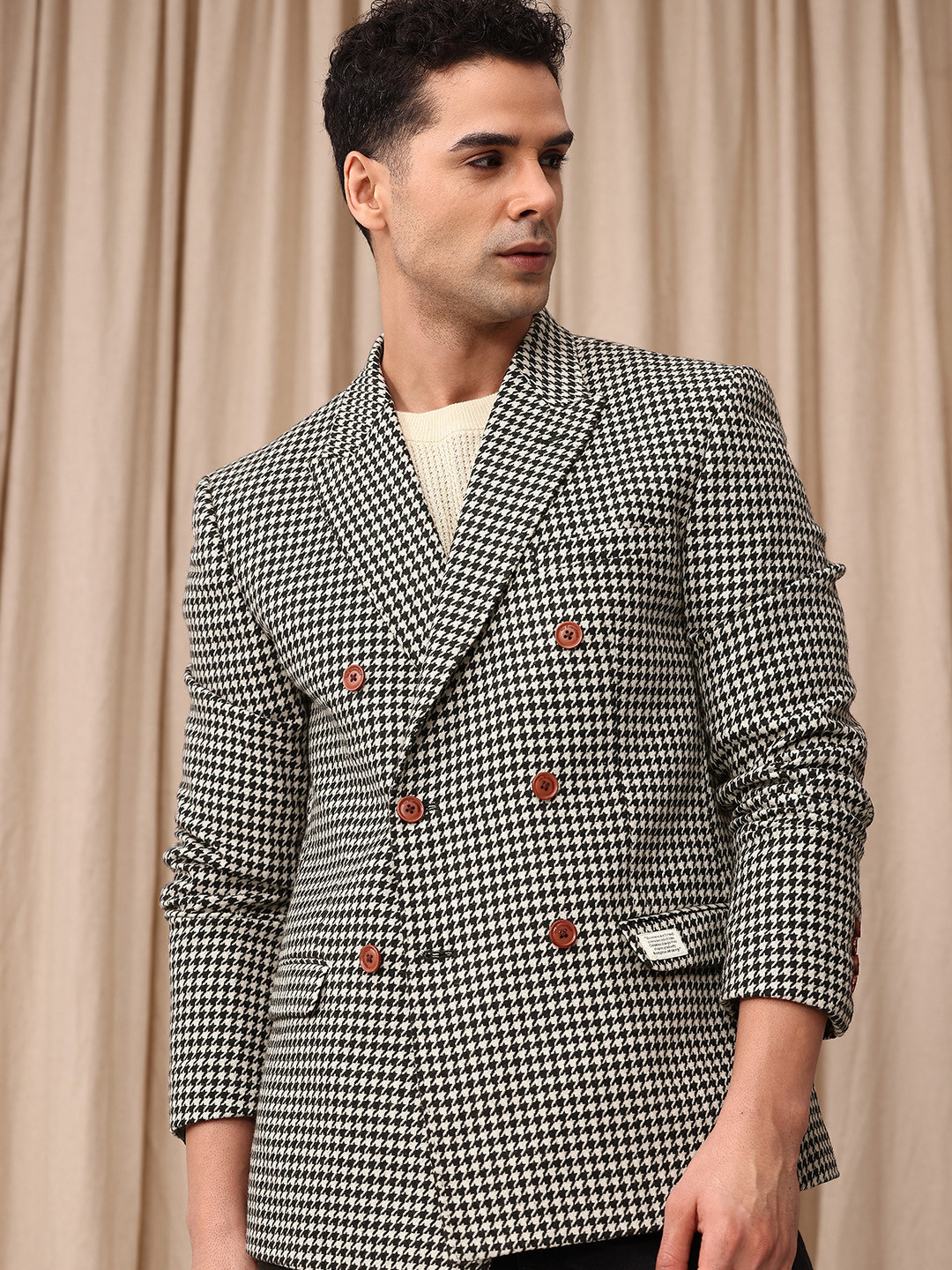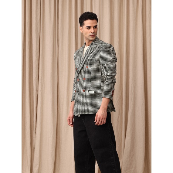 Black & cream coloured tailored-fit casual blazer, has a peaked lapel, long sleeves, double-breasted with double button closure, two flap pockets, one welt pocket & inner pocket and a double-vented back hem