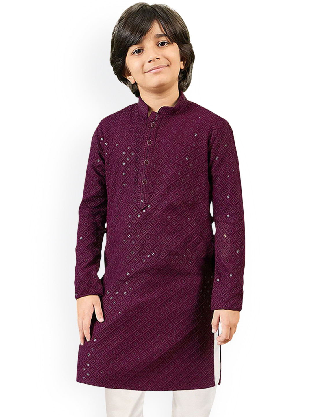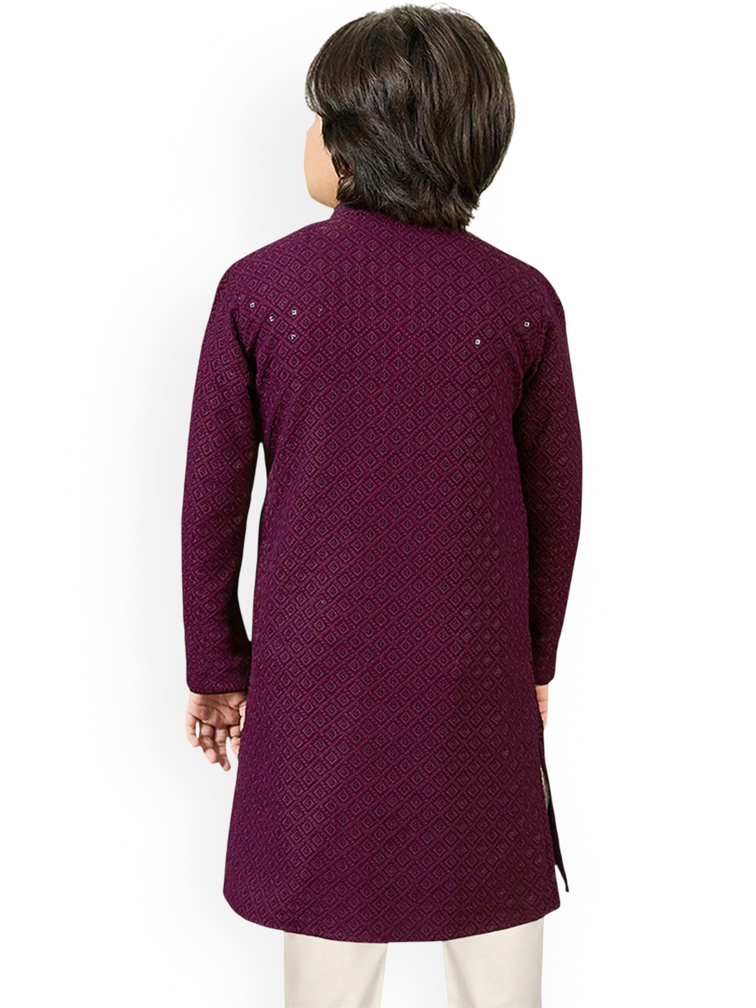 Boys Woven Design Embroidered Sequinned Mandarin Collar Kurta