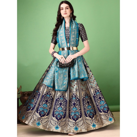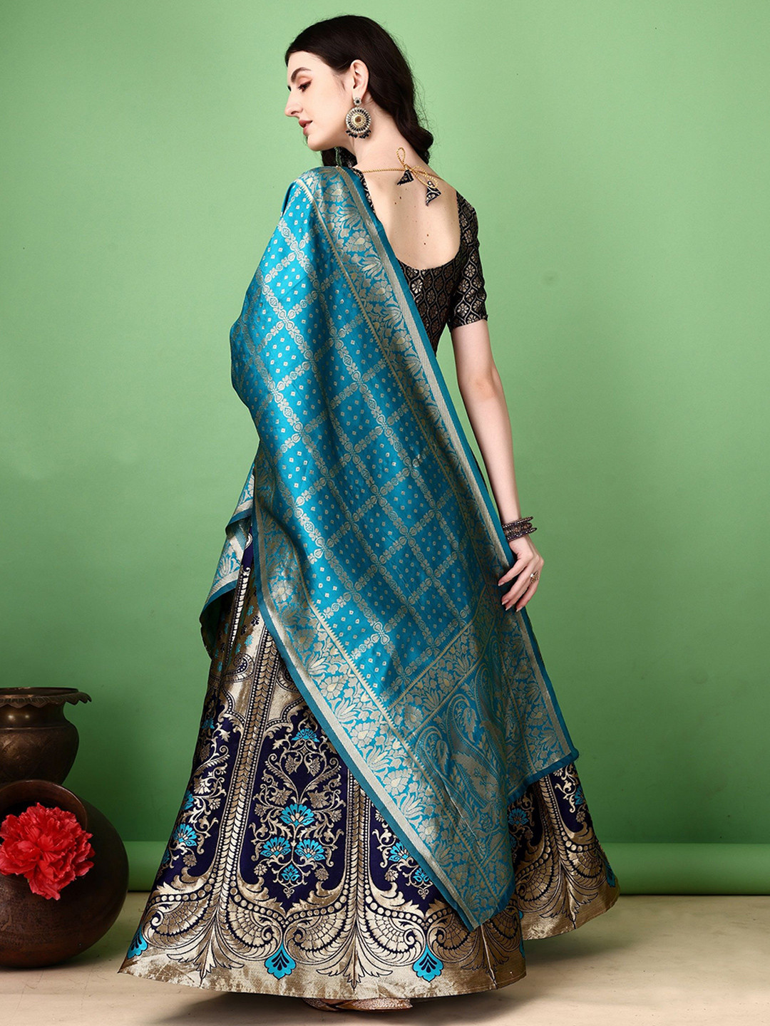 Blue and navy blue, gold-toned woven design lehenga choli with dupatta, zari