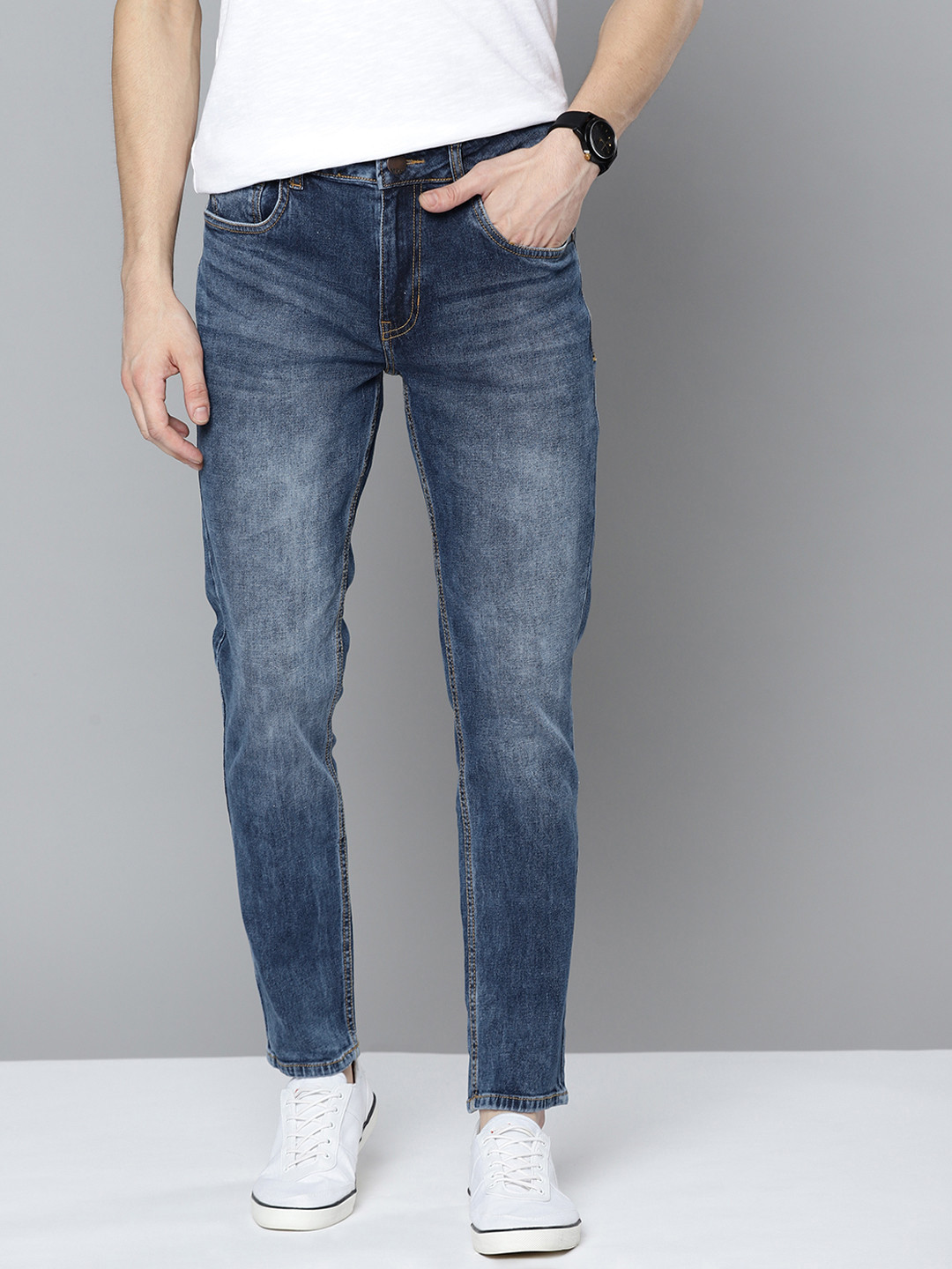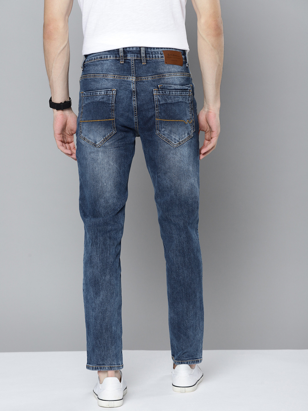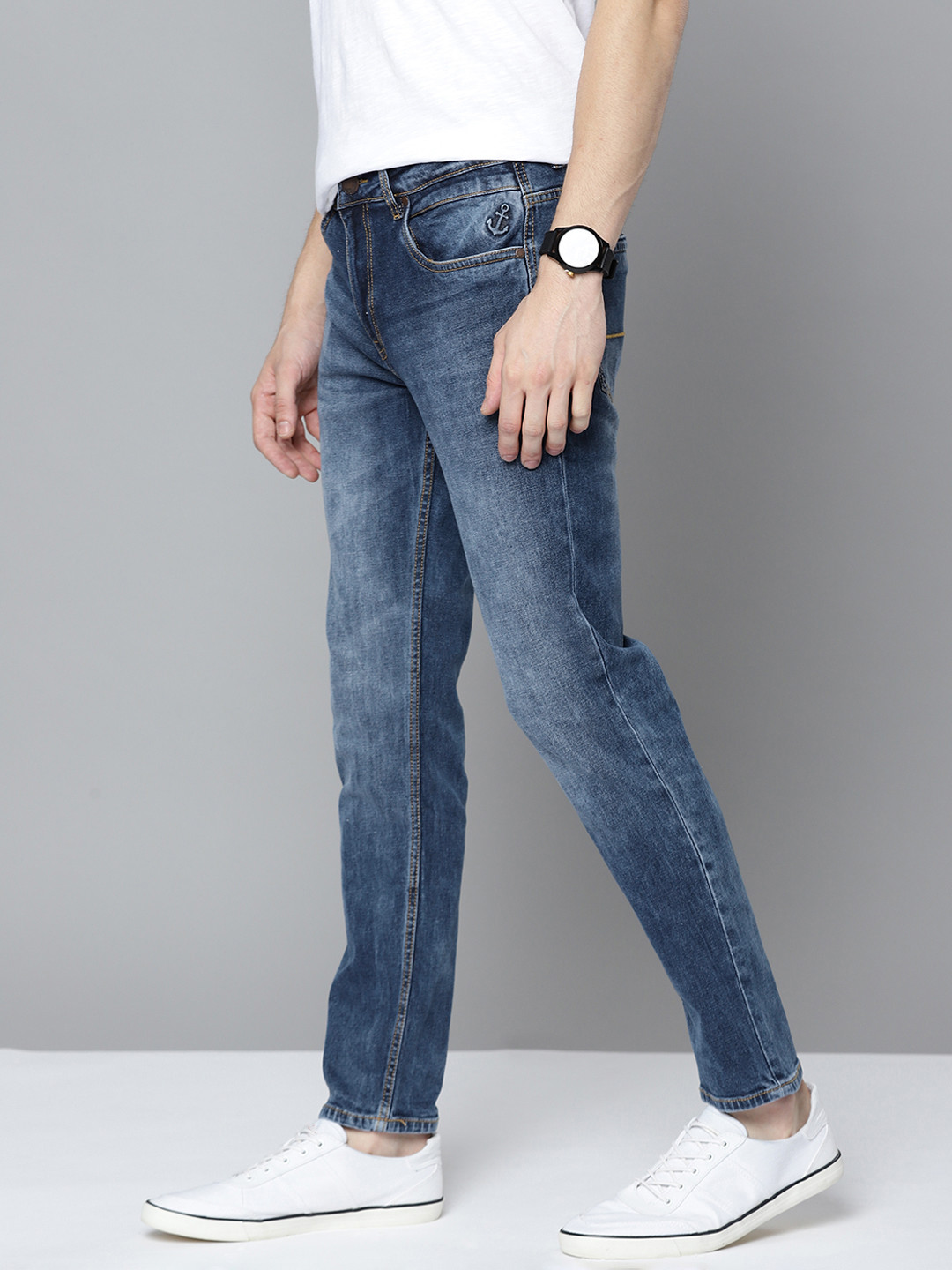 - Medium shade, light fade blue jeans