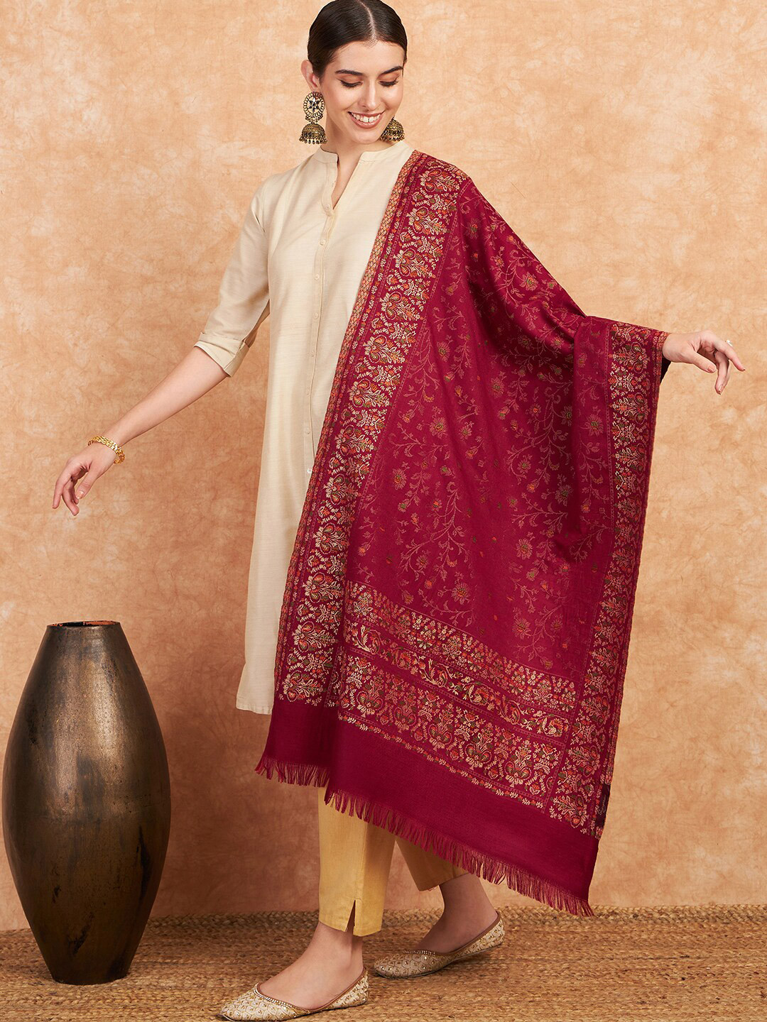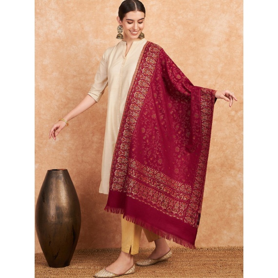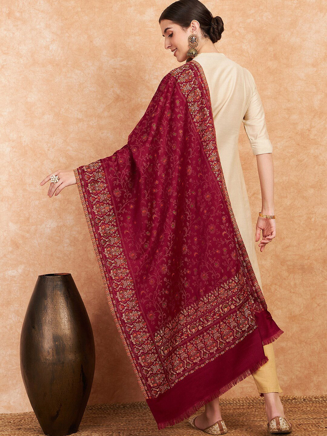 Maroon & gold-toned foral woven design winter pashmina shawl with taselled border