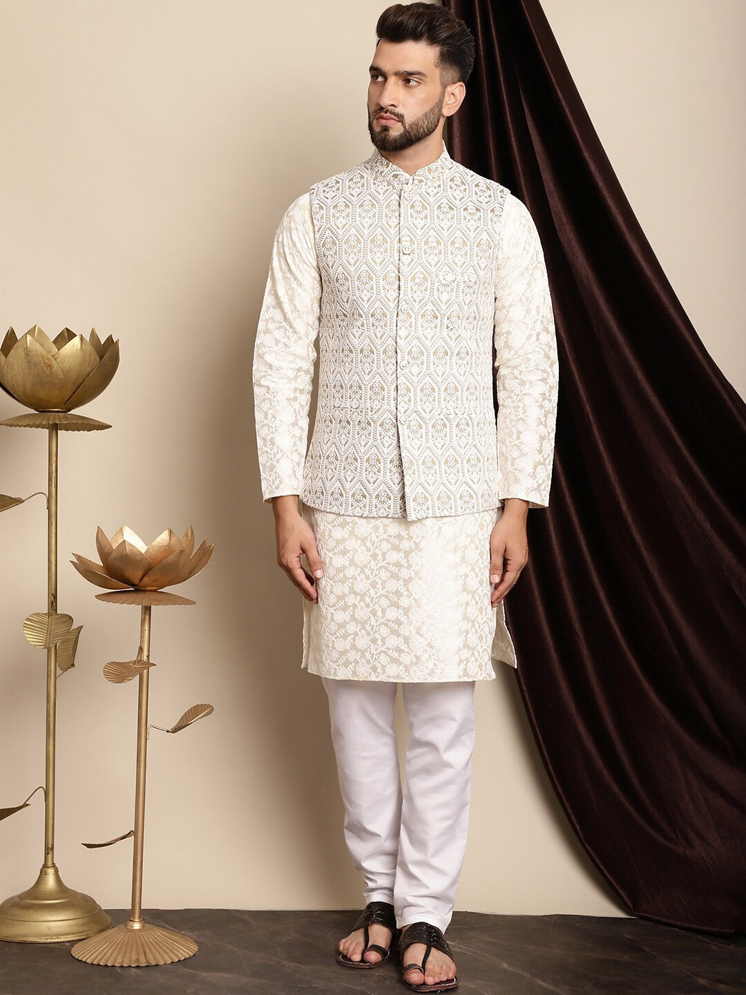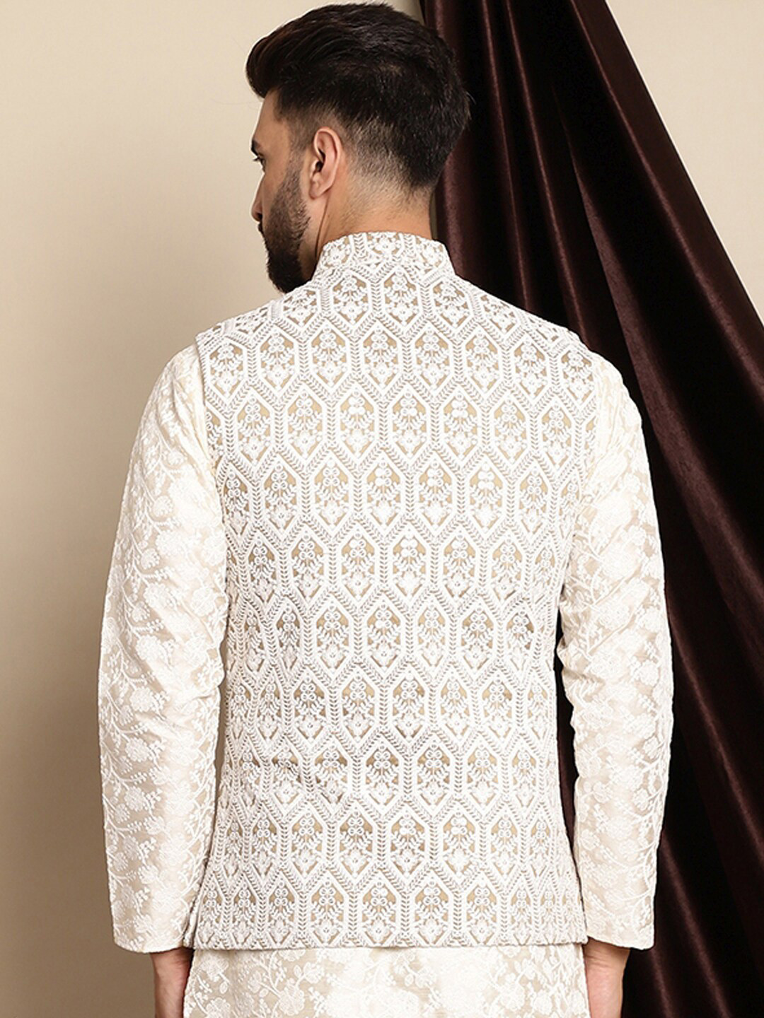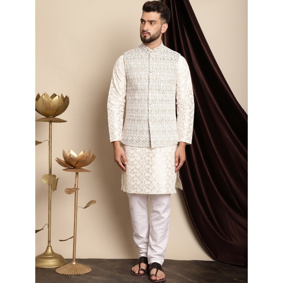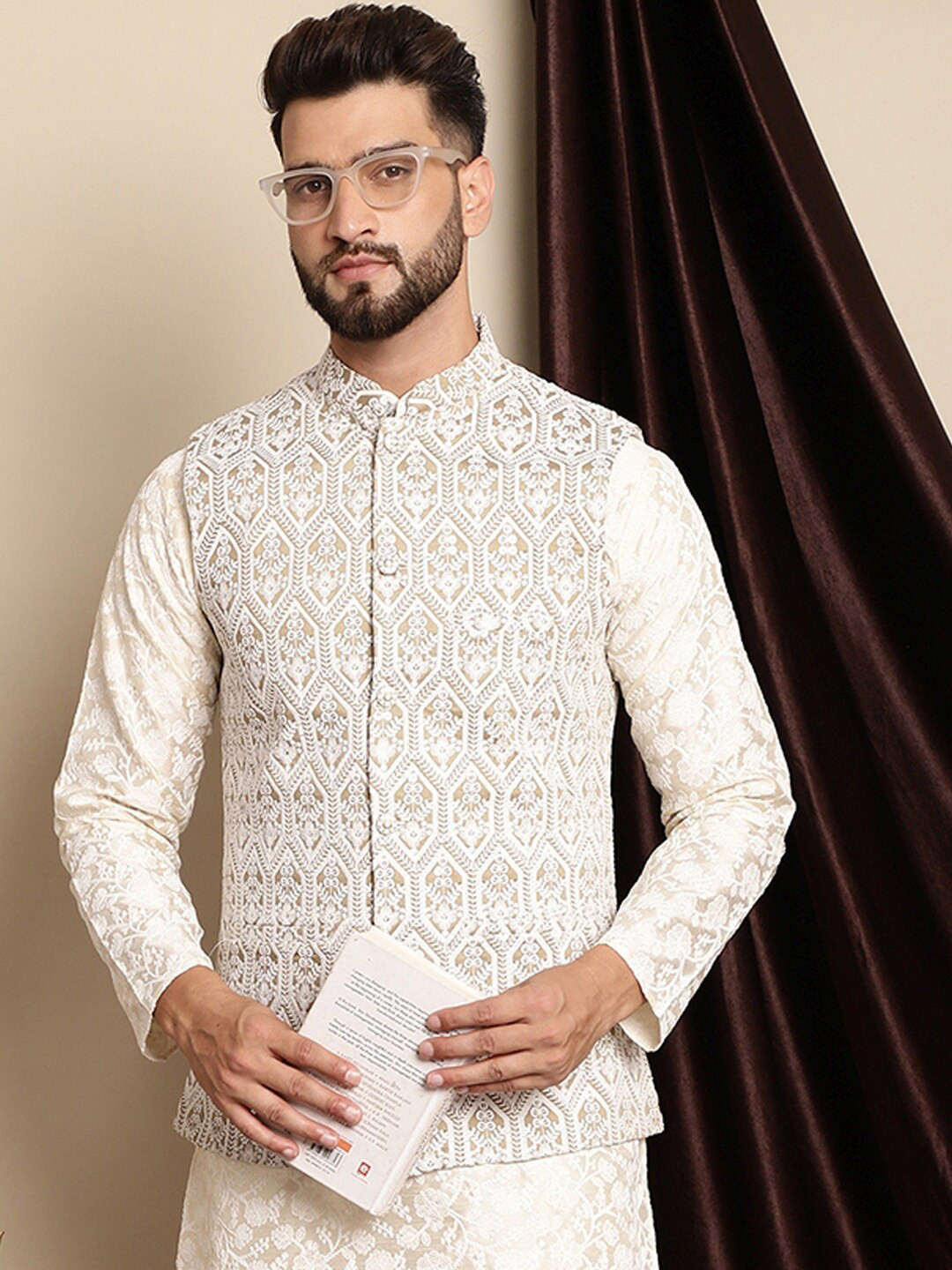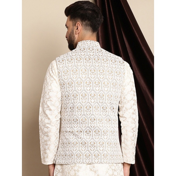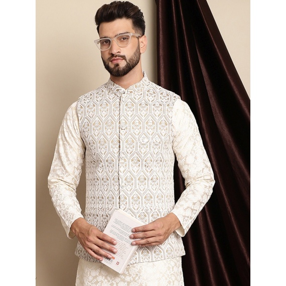 Metalic coloured and white embroidered woven Nehru jacket, has a mandarin collar, a full button placket, sleeveless, three pockets