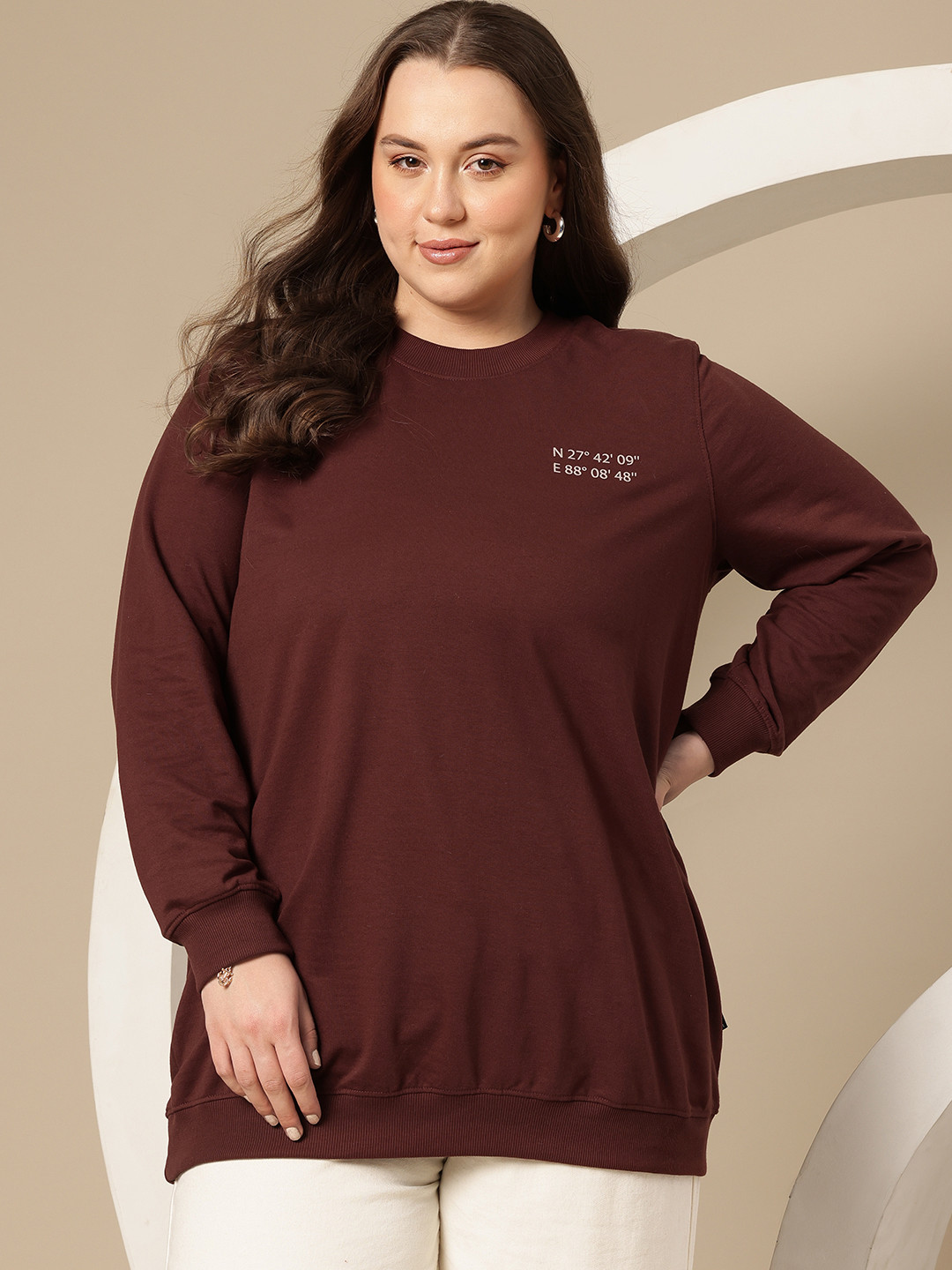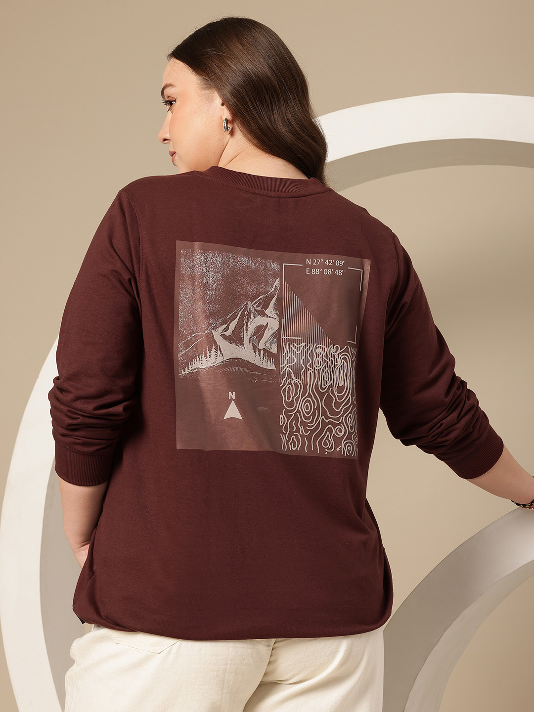 Brown graohic printed sweatshirt has a round neck, long sleeves, ribbed hem
