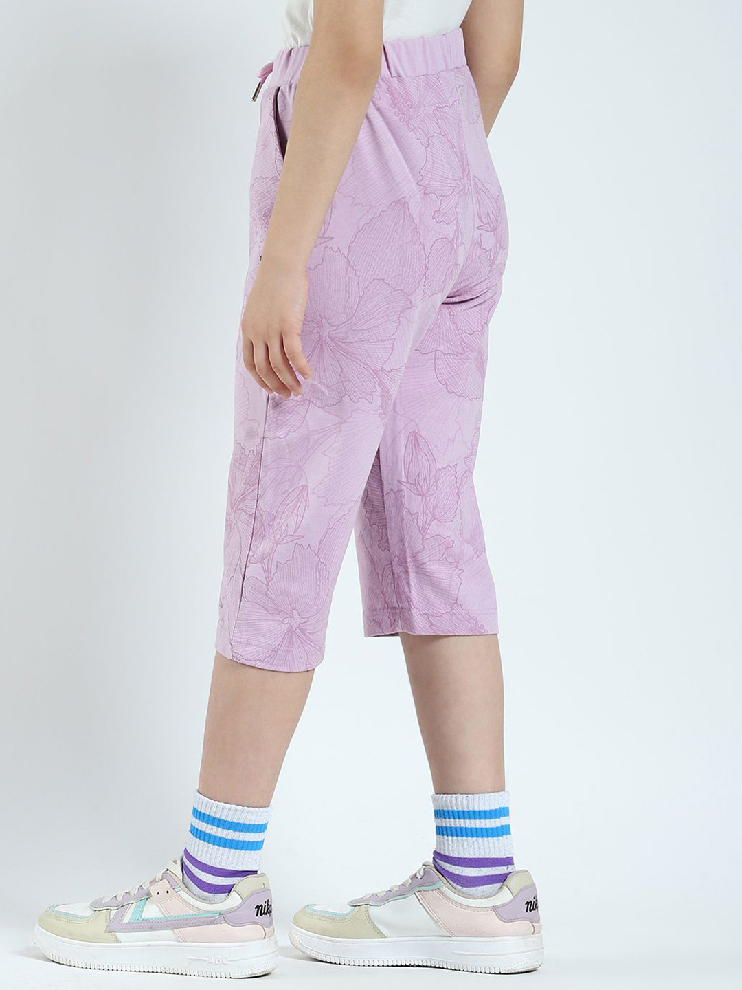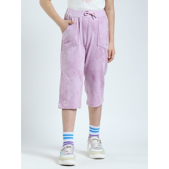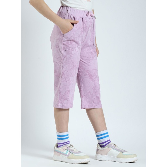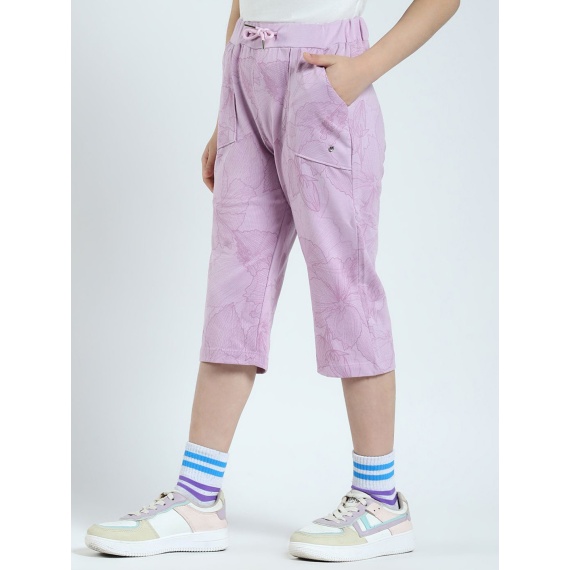 Lavender mid-rise printed capris, waistband with drawstring closure, 2 pocket