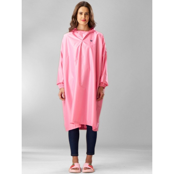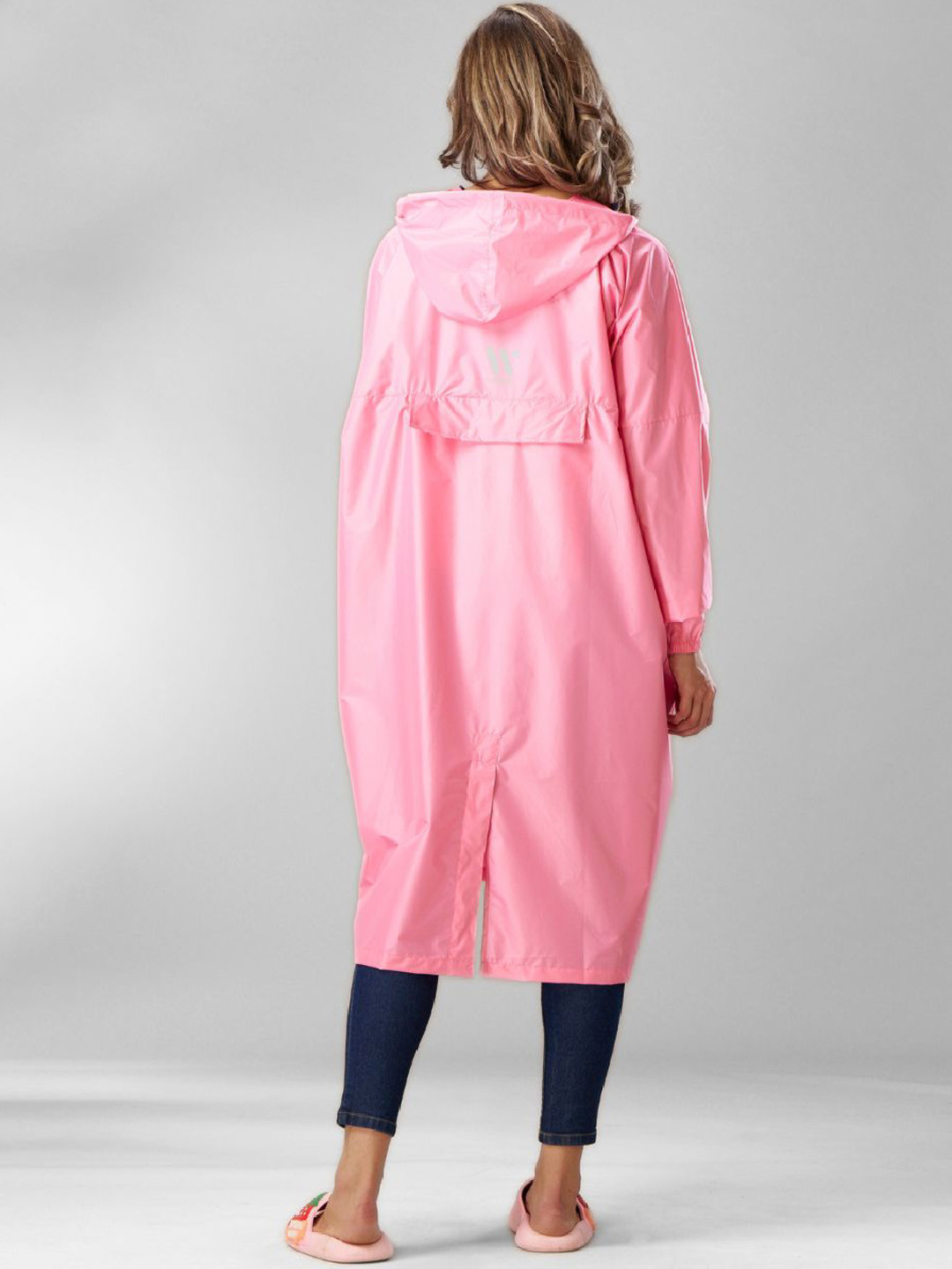 Pink solid waterproof rain jacket, has an attached hood, seam sealed with adjustable hems, long sleeves, back slit and slip-on closure